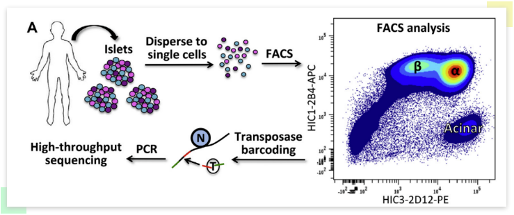 文章使用高灵敏度的 ATAC-seq 分析人 α 细胞和 β 细胞中的开放染色质,高精度定位潜在的 α 细胞和 β 细胞特异性基因的调控区域。与人 α 细胞和 β 细胞转录组的整合发现了这两种细胞类型的特征基因。对 ATAC-seq 所定义的开放染色质区域与一些糖尿病风险 snp 位点有重叠,以及对可能在 α 和 β 细胞中发挥重要作用的新转录因子有富集。本研究为未来的研究提供了一个重要的数据集和多种新的研究途径。