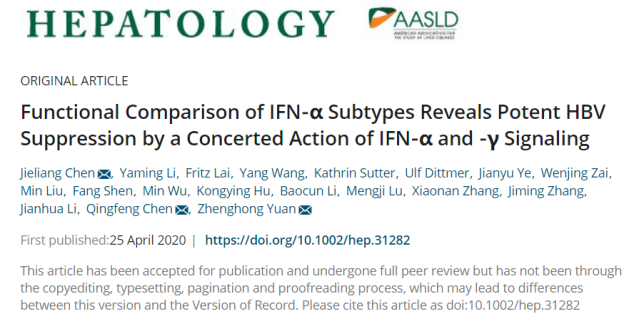 复旦大学基础医学院陈捷亮副教授、李亚明博士及 IMCB Fritz Lai 博士为论文共同第一作者,陈捷亮、陈清烽和袁正宏为论文共同通讯作者题为 Functional Comparison of IFN-α Subtypes Reveals Potent HBV Suppression by a Concerted Action of IFN-α and -γ Signaling”,近日在肝病学领域国际学术期刊《Hepatology》发表,该研究在先前发现肝细胞自身干扰素应答水平与 IFN- α 抗 HBV 效果密切相关的基础上,揭示了一种可有效改善干扰素低应答和抗病毒效果高于 IFN-α2 的人 IFN- α 亚型,其能够诱导肝内 I 型和 II 型 IFN 通路的协同激活从而高效抑制 HBV。 伯豪生物为该研究提供表达谱芯片服务。