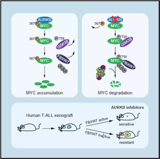 研究人员通过蛋白组学研究,确定了 Aurora 蛋白激酶家族中的 AURKB 可以直接与 MYC 结合,除 AURKB 可显著降低内源性 MYC 的半衰期,表明 AURKB 与 MYC 的稳定性密切相关。利用 RNA 测序技术(上海伯豪生物提供服务)对 AURKB 敲除后的细胞系进行检测,结果显示 MYC 靶向基因发生了显著变化。进一步的机制研究表明,AURKB 可以磷酸化 MYC 第 67 位丝氨酸(S67),S67 磷酸化会阻碍 MYC 与 GSK3β 的相互作用,抑制 MYC 第 58 位苏氨酸(T58)的磷酸化,从而阻碍 E3 泛素连接酶 FBXW7 与 MYC 的结合,进而阻断 MYC 的降解途径,显著增强 MYC 的稳定性。与此同时,研究发现 TALL 中的 MYC 能够直接激活 AURKB 的转录,形成 AURKB-MYC 正反馈调控环路参与调节 MYC 的致癌作用。通过建立 MYC 介导的 T -ALL 斑马鱼模型,研究人员进一步确定体内 AURKB-MYC 正反馈调控环路对 T -ALL 的发生发展至关重要。