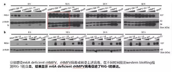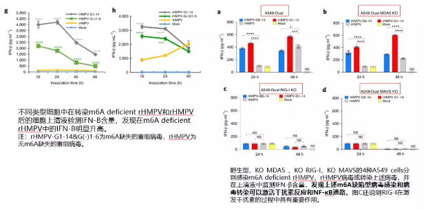 作者使用人类偏肺病毒(HMPV)作为模型,证明 m6A 修饰可作为病毒 RNA 上的分子标记物来躲避宿主对非自身 RNA 的先天性免疫识别。HMPV RNA m6A 修饰促进了 HMPV 的复制和基因表达。通过同义突变或去甲基化酶构建 m6A 缺陷型重组 HMPV 病毒(m6A-deficient rHMPV),发现诱导了宿主Ⅰ型干扰素的分泌增加,并发现这取决于细胞质中的传感器 RIG-I。m6A-deficient rHMPV 在棉鼠体内实验表明干扰素分泌增加,毒性减弱,但保留了高免疫原性。