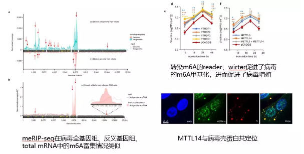 作者对病毒 RNA 基因组上 m6A 修饰对病毒感染能力和与宿主互作过程进行探索。通过构建 rHMPV、m6A-deficient rHMPV 病毒和病毒 RNA 分别感染和转染宿主细胞来探索宿主免疫应答过程中起关键作用的介质。 文中病毒基因组 m6A 检测方法不同于 上篇软文 病毒 RNA m6A 的检测方法,上篇是提取病毒感染宿主后的 total RNA,再分别和各自的参考基因组比对。这里作者是使用了超微量 MeRIP-seq 试剂盒(只需 1 -5ug),直接对病毒 RNA 建库测序,再比对分析。