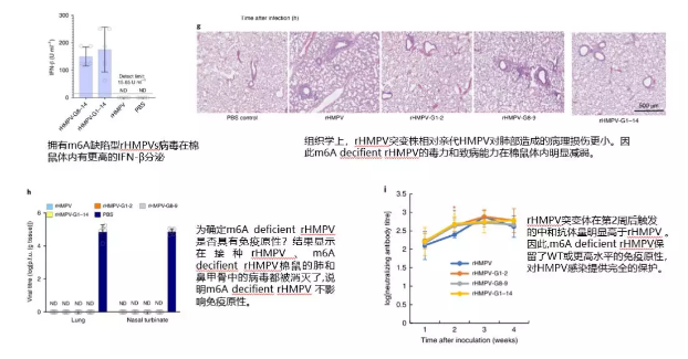 文章发现 RSV 基因组上发生了 m6A 甲基化,这些位点可正向调节 HeLa 和 A549 细胞中 RSV 的复制,基因表达和病毒产生。通过对 m6A 位点进行点突变构建 m6A 缺陷型 rgRSV,发现 rgRSV 在 A549 细胞的复制,基因表达,扩散和病毒成熟等方面都明显减少。棉鼠体内实验显示 m6A 突变型 rgRSV 感染棉鼠后,上呼吸道和下呼吸道中病毒复制减少,且肺部病变较轻。同时发现 m6A 突变型 rgRSV 在棉鼠体内实现显示毒力减弱明显,但仍保留了野生型毒株的免疫原水平,说明 m6A 修饰缺陷型的病毒可用于为未来疫苗研制候选。