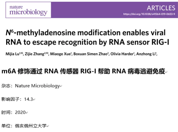 RNA 转录后修饰对于宿主细胞区分自身和非自身核酸是非常重要的分子标记。通常自身 mRNA 在 5' 端有帽子结构,同时在鸟嘌呤(G)N7 和 ribose-2′- O 位置发生甲基化,就不会被 RIG- I 和 MDA5 识别发现。 然而,当 mRNA 缺失该结构(甲基化),免疫系统就会识别到非自身的 RNA。病毒很聪明,为了避免被干掉,进化出 RNA 甲基化修饰,以避免被免疫系统发现干掉。