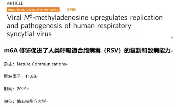 其实在 2019 年何川和 Li Jianrong 就发表了文章“m6A 修饰促进了人类呼吸道合胞病毒(RSV)的复制和致病能力”,研究思路与上篇基本一致,但研究对象换了另一种病毒 RSV。