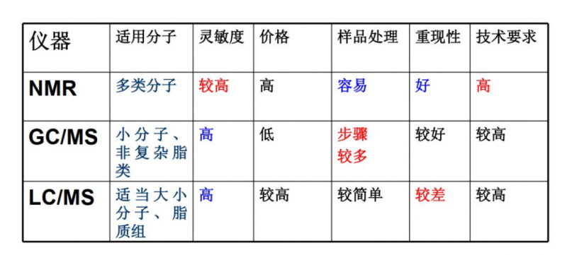 非靶向代谢组学中常用的技术平台有 GC-MS(气质联用仪)、LC-MS(液质联用仪)和 NMR(核磁共振)。在代谢组学的初期,代谢组学研究中 NMR 与 LC/GC -MS 文献几乎各占半壁江山,如今随质谱技术的普及及发展,以质谱平台居多。NMR 检测可以对代谢物同时定性和定量分析,但是由于灵敏度不高,因而检测到的动态范围有限,此外 NMR 设备价格昂贵,亦是目前应用较少的原因之一。色谱质谱联用技术,由于出色的灵敏度和分辨率,可以检测到的代谢物动态范围更为广泛。