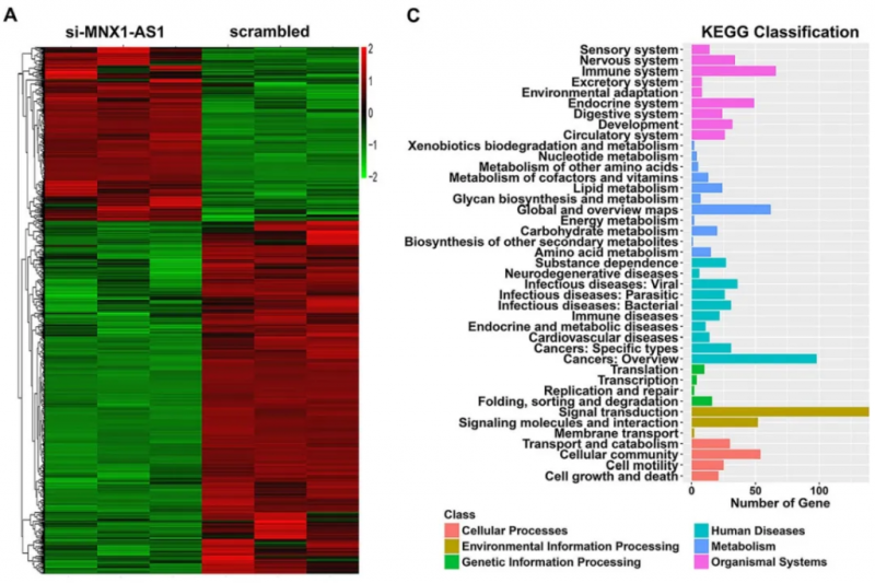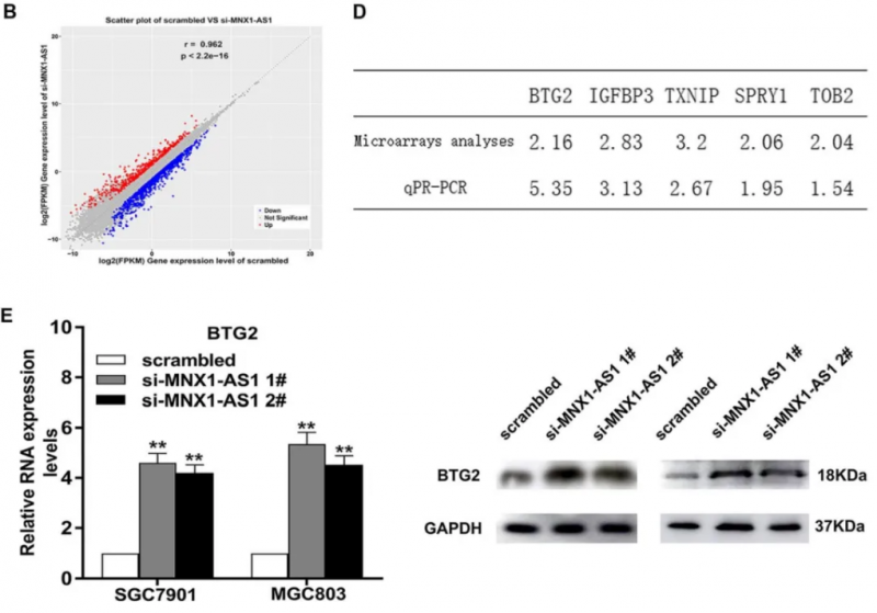 BTG2 是 GC 中 MNX1-AS1 的关键下游目标。a. 对照组与 si MNX1-AS1 组 RNA 转录序列的散点图。b. 分级聚类基因转录在 SGC7901 细胞中 MNX1-AS1 敲除后发生改变(倍数变化大于 1.5)。c. GO 分析 MNX1-AS1 基因敲除后的所有突变基因。我们使用 qRT-PCR 检测来选择性地检测参与 GC 进展的几个基因的改变。在 MNX1-AS1 敲除的 GC 细胞中,e. BTG2 在 mRNA 和蛋白水平上都有明显的表达