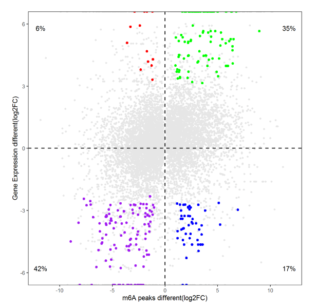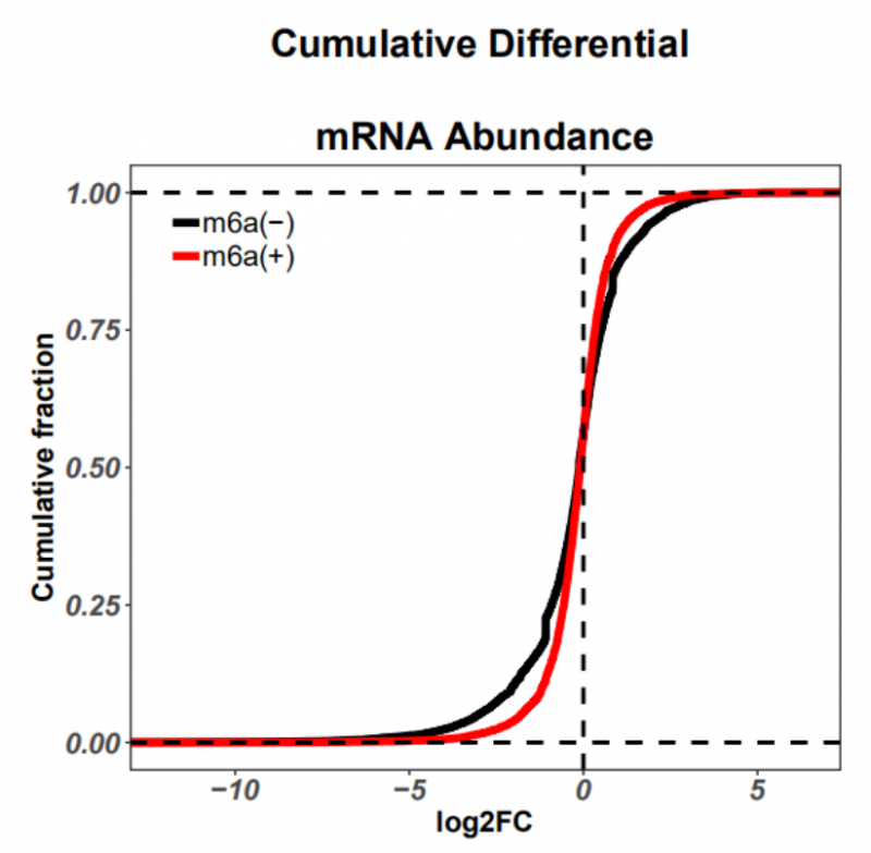 关联分析累计分布图, 具有 m6A 修饰的 RNA 表达较为稳定