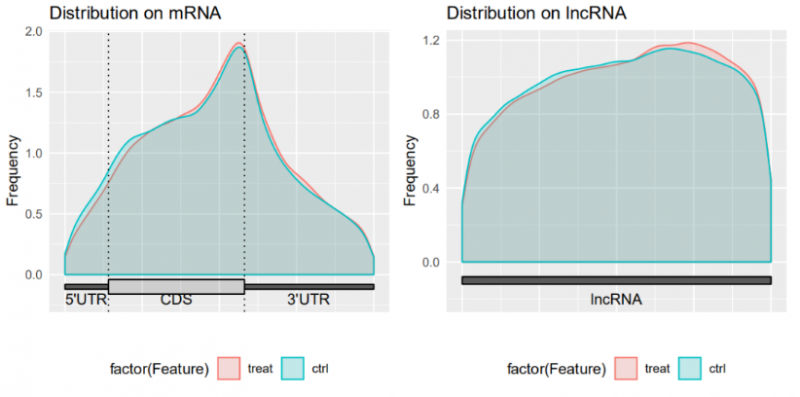 Peak 在 RNA 结构上的分布 metageneplot 图(T 组与 C 组)