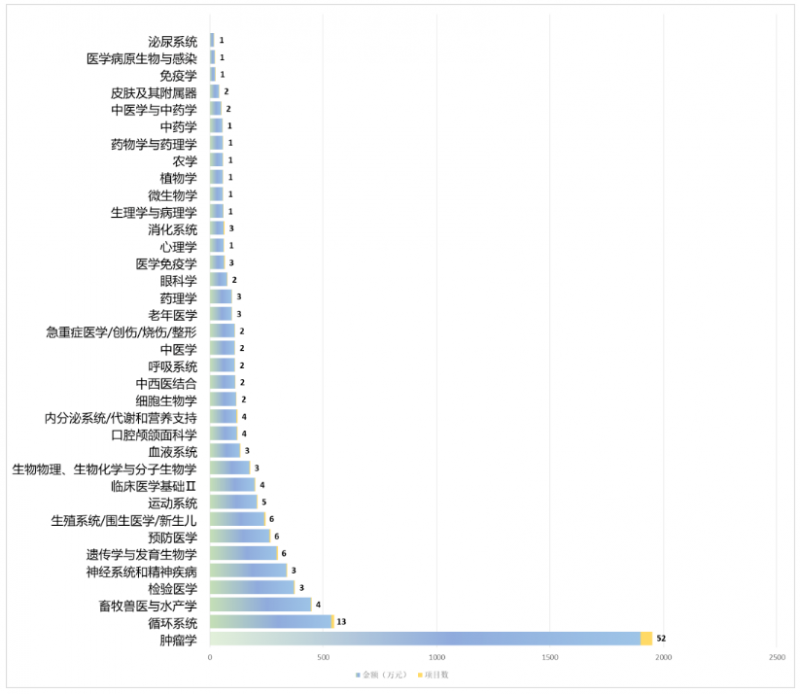 RNA m6A 修饰作为 2019 年国自然申请中的黑马,2019 年 m6A RNA 甲基化项目共计 179 项,总金额 1.1 亿元左右,单项目获批金额有 305 万元,其中面上项目 89,青年科学基金项目 81。下图清晰展示了 RNA m6A 修饰在不同学科研究中的获批情况,大多数项目都是与医学(健康或疾病)相关,农口相关的项目仅 10 项。医学疾病领域,肿瘤仍然是主要的方向,约 77 项。常见的包括肺癌、肝癌、胃癌、乳腺癌和结直肠癌等。研究的主要内容包括 m6A 修饰如何影响肿瘤的发生、增殖、转移、耐药等。