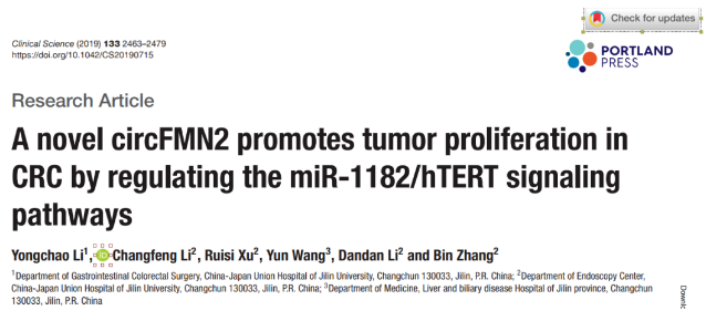 | 2019 | A novel circFMN2 promotes tumor proliferation in CRC by regulating the miR-1182/hTERT signaling pathways | Clin. Sci. | 5.24 |