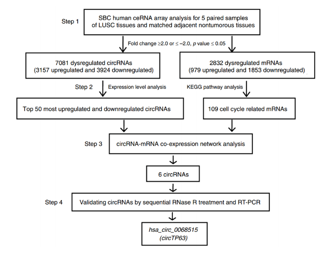 本文研究人员利用 ceRNA 芯片检测了 5 对 LUSC 患者组织中 circRNA 和 mRNA 的表达谱。通过分析差异表达的 circRNA 和 mRNAs 的共表达网络,发现细胞周期相关的 circRNA circTP63 在 LUSC 组织中上调,且其上调与 LUSC 患者肿瘤体积较大、TNM 分期较高有关。circTP63 的表达升高促进了癌细胞在体内和体外的增殖。从机理上讲,circTP63 与 FOXM1 共享 miRNA 反应元件。