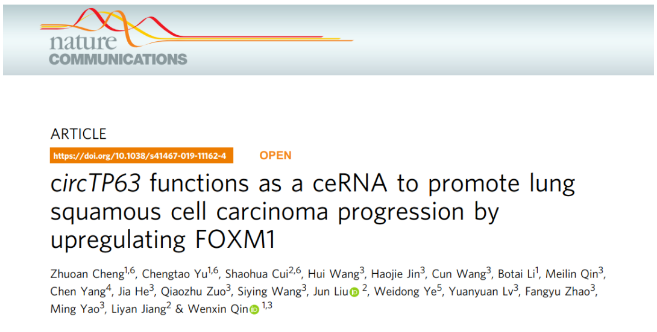 | 2019 | circTP63 functions as a ceRNA to promote lung squamous cell carcinoma progression by upregulating FOXM1 | Nat Commun | 11.88 |