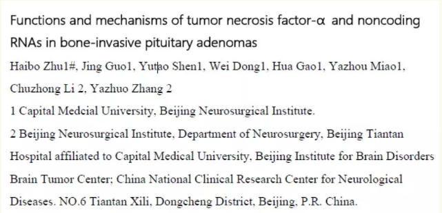 研究人员对 274 位垂体腺瘤患者进行随访及临床变量分析,结果显示骨侵袭与女性,肿瘤大体积,非总切除(NGTR)和肿瘤再生之间存在显著相关性。与 NBIPAs 相比,BIPAs 的 PFS(无进展生存期)更差。利用 ceRNA 芯片、miRNA 芯片对 BIPAs 和 NBIPAs 患者的肿瘤组织进行差异 RNA 表达检测及差异分析,结果显示炎症和免疫因子在 BIPAs 中起重要作用,TNF- α 可直接诱导 BIPAs 中的破骨细胞分化。NR_033258,lncRNA SNHG24,miR-181c-5p 和 miR-454-3p 可以调节 TNF- α 的表达。因此,TNF- α 及其相关的 lncRNA 和 miRNA 可能是未来 BIPAs 潜在的治疗靶点。