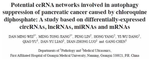 研究人员利用 ceRNA 芯片、miRNA 芯片对由氯喹二磷酸引起自噬抑制的 PANC- 1 细胞中的 mRNA、miRNA、lncRNA、circRNA 进行了表达检测,与对照相比,共发现 3,966 个 mRNA,3,184 个 lncRNA 和 9,420 个 circRNA 发生了差异表达。在自噬抑制组中仅有两个 miRNA(hsa-miR-663a-5p 和 hsa-miR-154-3p)在 PANC- 1 细胞中低表达。miR-663a-5p 可以和 9 个 circRNA,8 个 lncRNA 和 46 个 mRNA 形成与胰腺癌细胞自噬相关的前瞻性 ceRNA 网络。此外,还构建了另一个含有 miR-154-3p,5 个 circRNA,2 个 lncRNA 和 11 个 mRNA 的 ceRNA 网络。这种潜在的 ceRNA 调控网络可能在胰腺癌细胞自噬中发挥关键作用,为后续胰腺癌的研究奠定理论基础。