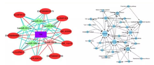 图 2  TNF 相关的 ceRNA 网络图及显著富集的 pathway network