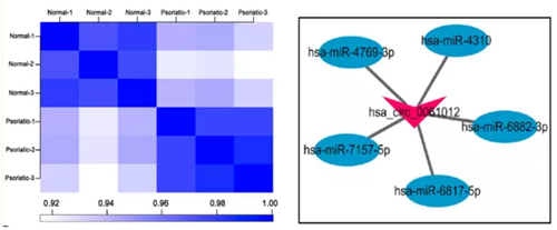 图 5   样本相关性图及 hsa_circ_0061012 与 miRNA 调控网络图