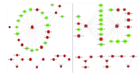 研究人员利用 ceRNA 芯片对 LNM 转移和非转移的 HCC 患者血清进行 lncRNA 和 mRNA 表达检测,共筛选到 234 个 lncRNA 和 58 个 mRNA 在 LNM 转移 HCC 患者体内显著差异表达。对差异表达的 mRNA 进行功能富集分析,结果显示差异基因主要与内质网蛋白加工和焦点黏连相关。对差异 lncRNA 和 mRNA 进行共表达分析,并对共表达网络图中的 mRNA 进行功能富集分析,结果同样显示这些基因与 HCC 淋巴结转移相关。