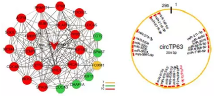 图 1   circTP63 与 mRNA 共表达网络图及与 circTP63 结合的 miRNA 预测图