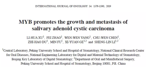 利用 ceRNA 芯片对新鲜冷冻的 SACC 和正常颌下腺(SMG)组织进行 RNA 表达检测,并分析 MYB 和上皮 - 间质转化(EMT)标记之间的关联。与正常 SMG 组织相比,SACC 组织中 MYB 高表达,且 MYB 与 CDH1 表达呈负相关,并且与 VIM 正相关,表明 MYB 与 SACC 转移相关。过表达 MYB 促进 SACC 细胞的增殖,迁移和侵袭,敲低则抑制了这些活动。当 MYB 过表达时,CDH1 表达下调,CDH2,VIM 和 ACTA2 表达上调。在非肥胖糖尿病 / 免疫缺陷小鼠体内研究 MYB 对肺肿瘤转移的影响,通过尾静脉将 MYB 过表达和对照细胞注射到小鼠体内,结果显示 MYB 促进 SACC 肺转移。该研究结果表明 MYB 在 SACC 组织中异常过表达,并促进 SACC 细胞增殖和转移,表明 MYB 可能是 SACC 的新型治疗靶标。