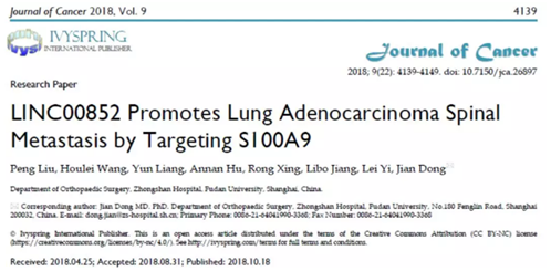 研究人员利用 ceRNA 芯片对原发性肺腺癌患者、肺腺癌 SM 患者和正常人的脊柱样本进行差异 lncRNA 筛选,发现 LINC00852 和 MAPK 途径与肺腺癌 SM 有关。此外,体内外实验表明 LINC00852 的靶基因 S100A9 对肺腺癌细胞的生长,迁移,侵袭和转移中具有正调节作用。S100A9 能强烈激活 P38 和 REK1 / 2 激酶,并轻微激活 A549 和 SPCA- 1 细胞中 MAPK 途径中 JNK 激酶的磷酸化,促进肺腺癌 SM 的进展和致癌能力。这些研究发现提示在肺癌早期干预 SM 是潜在的治疗新靶点。