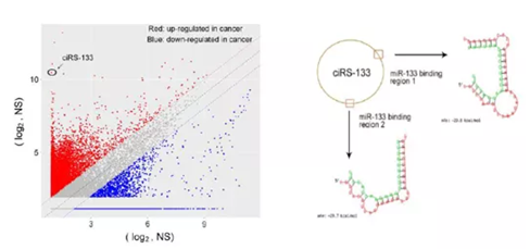 图 6   散点图展示 ciRS-133 及 ciRS-133 与 miR-133 的结合预测图