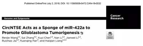 研究人员利用 ceRNA 芯片对 GBM 临床样本中差异表达的 circRNA 进行了筛选,通过 TargetScan 预测及 miRNA pulldown 实验,锁定了研究目标 circNT5E。体内外表型实验发现 circNT5E 不仅对 GBM 细胞的增殖、凋亡、迁移及侵袭有一定的影响外,还能有效促进体内 GBM 肿瘤的形成。从 ceRNA 角度分析发现 ADARB2 可以作用于线性 NT5E 前体上,解除 ADAR- 1 对 circNT5E 转录的抑制,高表达的 circNT5E 通过吸附到 miRNA-422a 上,解除其对下游靶基因的抑制作用,进而激活 Akt、Smad2 等信号通路来促进 GBM 细胞的增殖、迁移及侵袭等活动。