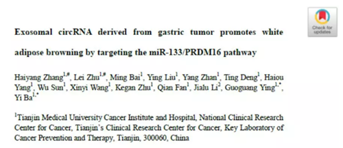 本研究通过 ceRNA 芯片技术对胃癌病人血浆外泌体中的 circRNA 进行检测,研究发现 ciRS-133 的表达与 BAT 的质量以及身体脂肪率呈正相关。外泌体来源的 ciRS-133 可以通过吸附 miR-133 来激活脂肪细胞的 PRFM16/UCP1 途径,促进 PRDM16 的表达,调节脂肪细胞的代谢活性,进而促进白色脂肪褐变,从而加速肿瘤的恶病质。