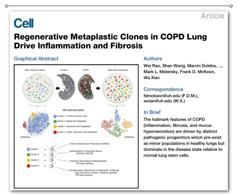 【摘要】慢性阻塞性肺病(COPD)是一种慢性支气管炎、小气道阻塞和肺气肿的进展性疾病,是世界范围内的主要死亡原因。虽然炎症、纤维化、粘液高分泌和上皮化生损伤是本病的特征,但它们的起源和依赖关系仍不清楚。本文将单细胞克隆技术应用于 COPD 患者和非 COPD 患者的肺组织。与对照肺不同,COPD 肺由正常的远端气道祖细胞支配,由三种不同的祖细胞浸润,这些祖细胞在表观遗传学上表现为明显的化生损伤。当移植到免疫缺陷小鼠身上时,这些变异克隆引起的病理变化类似于慢性阻塞性肺病的粘膜和鳞状上皮化生、中性粒细胞炎症和纤维化。