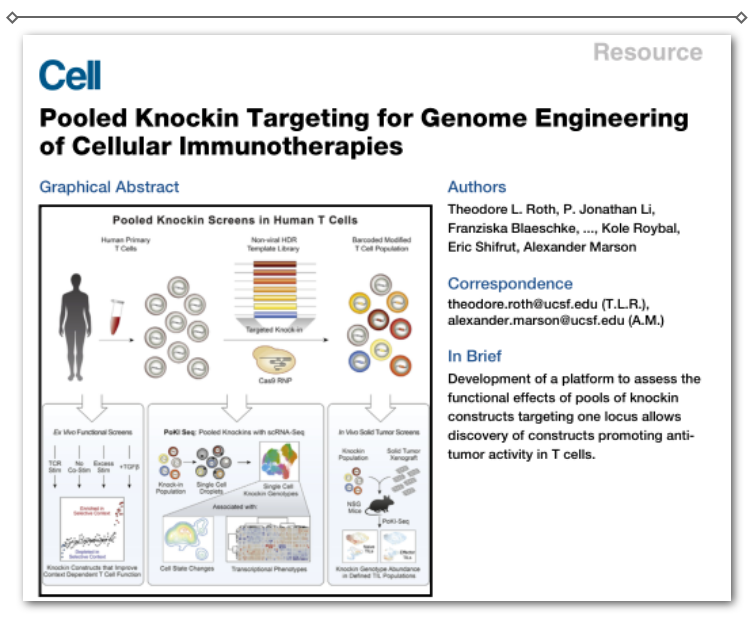 【摘要】基因修饰免疫细胞的过继转移为肿瘤免疫治疗提供了广阔的前景。CRISPR 靶向基因敲除可以改善细胞治疗,但需要更多的高通量方法来检测哪些基因敲除能增强体内原代细胞功能。作者开发了一种广泛适用于条形码和跟踪大型非病毒 DNA 模板的定向整合技术,并将其应用于在人类原代 T 细胞的联合敲除筛选。将数十个独特的条形码模板整合到 T 细胞受体(TCR)基因座中,揭示了增强体内外适应性的基因结构。作者进一步开发了联合靶向敲除测序(PoKI-seq),结合单细胞转录组分析和联合敲除筛选来检测细胞丰度和细胞在体内外的状态。该平台鉴定了一种新的转化生长因子 b(TGF-b)R2-41BB 嵌合受体,可提高实体瘤的清除率。