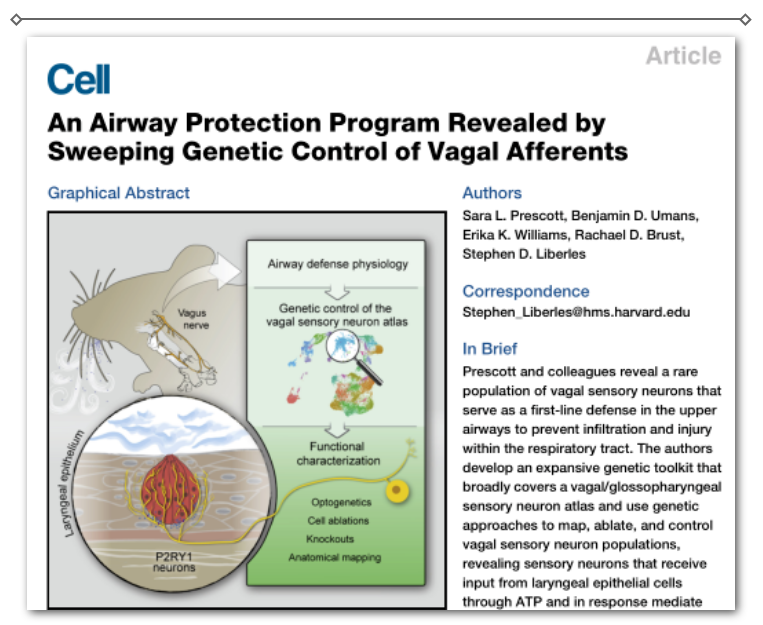【标题】迷走神经传入的遗传控制清除揭示了气道防御机制
