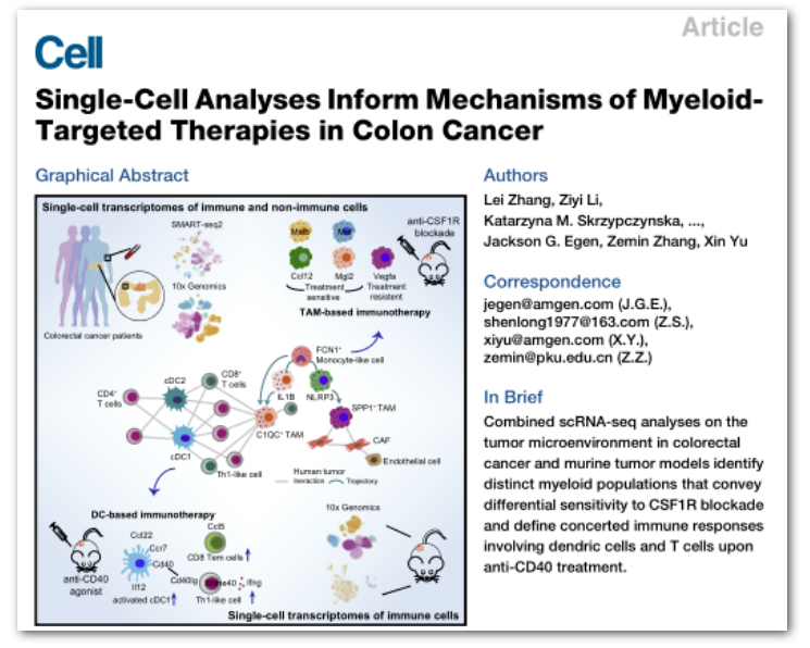 【摘要】单细胞转录组测序(scRNA-seq) 是鉴定肿瘤细胞多样性的重要工具,但其在免疫调节疗法机制的探索中的应用并不多。研究者对结直肠癌患者的免疫和基质细胞群体进行 scRNA-seq 分析,确定特异性巨噬细胞和经典树突状细胞(cDC) 亚群是肿瘤微环境中细胞互作的关键介质。在小鼠肿瘤中鉴定可比较的髓样细胞群能够描述其对髓样靶向免疫治疗的反应。抗 CSF1R 治疗优先耗竭具有炎症特征的巨噬细胞,但保留小鼠和人类表达促血管生成 / 肿瘤基因的巨噬细胞群。用 CD40 激动剂抗体治疗可优先激活 cDC 人群,增加 Bhlhe40+Th1 样细胞和 CD8+ 记忆性 T 细胞。作者对人和小鼠的主要髓细胞亚群的综合分析揭示了调节肿瘤免疫关键细胞的相互作用,并明确了目前正在进行临床试验的髓细胞靶向免疫疗法的机制。