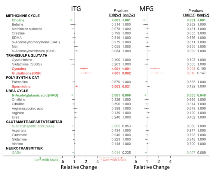 本研究的主要分析不同组之间代谢物水平的差异,研究者在两个主要大脑区域 ITG,MFG 以及次级控制区域 CB 中的预先定义代谢物类别用线性混合效应模型,其中以 log2 转换浓度作为因变量,组作为固定效应,非结构化的组内残差相关性,Huber-White 稳健方差估计,然后使用的相同的方法,仅针对主要大脑区域(即 ITG 和 MFG),分析脑组织代谢物与 Braak 和 CERAD 病理评分的相关性。利用广义估计方程(GEE)聚类分析和独立 Kruskal-Wallis 检验的非参数 Spearman 相关进行敏感性分析,得到了相似的结果(图 1 -3)。