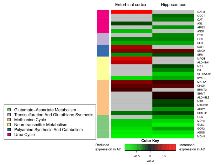 甲基化和多胺途径相关的生化反应的六个类别中的 33 个基因(FDR 校正的 p 值 <0.05)中,AD 和 CN 的 ERC /HIP 区域的基因表达水平发生了变化。使用 FDR 校正多次后,AD 和 CN 样品之间基因表达的这些差异具有统计学意义,与 CN 相比,图 4 总结了 AD 患者的 HIP/ERC 中与转甲基化和多胺代谢相关的所有六类生化反应的差异表达基因。灰色表示 AD 患者和对照组的基因表达没有显著差异。