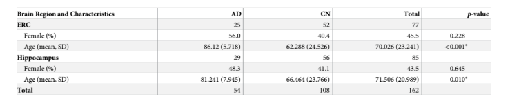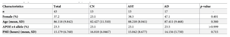研究者采用 R -Studio1.1.453 和 STATA16.0 软件进行分析。使用 α 值 0.05 来确定统计学意义。同时进行了多重比较方法 Benjamini-Hochberg 错误发现率(FDR=0.05)和 bonferoni 校正(FWER=0.05)。两种比较方法均校正了 52 种比较(26 种代谢物×2 个主要脑部区域 ITG 和 MFG),这些比较是基于它们对不同 AD 病理的易感性而预先指定的。检查了三组(AD,ASY 和 CN)在性别,APOEε4 携带者状态(Fisherexact 试验),年龄和验尸间隔(PMI)(Kruskal-Wallis 测试)方面的差异样。信息如表 2: