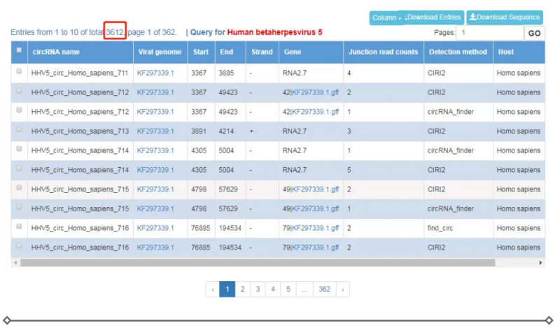 单击相应的病毒即可得到该病毒的 circRNA 信息,以 Human betaherpesvirus 5 病毒为例,可以搜索到 3612 个 circRNA,包括名字,病毒的基因组信息,circRNA 的位置信息,circRNA 所属的基因 name,检测到该 circRNA 的 junction reads 数,预测出该 circRNA 的方法,以及该病毒的宿主等信息。