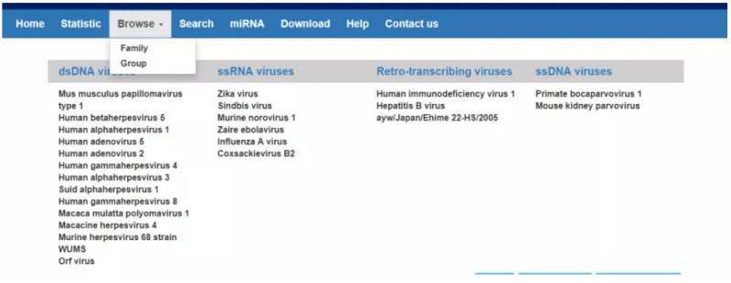 在数据库中可以通过 browse 来进行 circRNA 的搜索,包括可以在病毒所属的 family 层面和病毒核酸类型(group)来进行搜索。