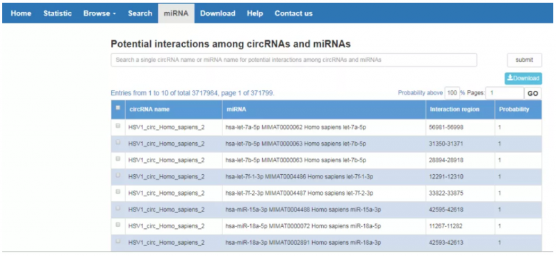 据报道,多种病毒 circRNA 在癌症的进展中起重要作用。例如,人乳头瘤病毒中的病毒 circRNA E7 (CircE7) 被 m6A 修饰,编码 E7 蛋白,可以调控癌细胞的增殖。同时 circRNA 可以作为 miRNA 的吸附海绵,来调控 mRNA 的表达,进而影响疾病的发生发展。那么病毒产生的 circRNA 是否可以通过吸附宿主的 miRNA,进而来调控宿主的基因表达呢?该数据库也提供了病毒 circRNA 和宿主 miRNA 结合的数据,包括病毒 circRNA name,宿主 miRNA name 以及两者的结合位点,及预测的可能性(%)。