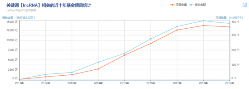 在之前的分享中小编给大家介绍过非编码 RNA 家族中的 circRNA , 如果说 circRNA 是目前生物学研究领域的流量担当,那 lncRNA 应是红遍大江南北了。从 lncRNA 历年文献发表情况和近十年国自然相关项目数据可以看出,lncRNA 在科研领域中热度年年攀升,并且高热不减。lncRNA 可以通过影响染色质结构和转录因子占位、表观遗传学、以序列和结构特异性结合生物大分子等机制调节基因表达,在发育、机体内平衡和维持细胞命运中发挥重要作用,lncRNA 的异常表达与包括癌症在内的多种疾病密切相关。随着高通量测序、lncRNA 芯片等技术的发展,越来越多的 lncRNA 被鉴定出来,但具体的作用与功能仍然不是很清楚,因此 lncRNA 的研究前景依然是十分广阔的,具有极大的研究价值。今天就与大家分享两篇新鲜出炉的 lncRNA 研究。