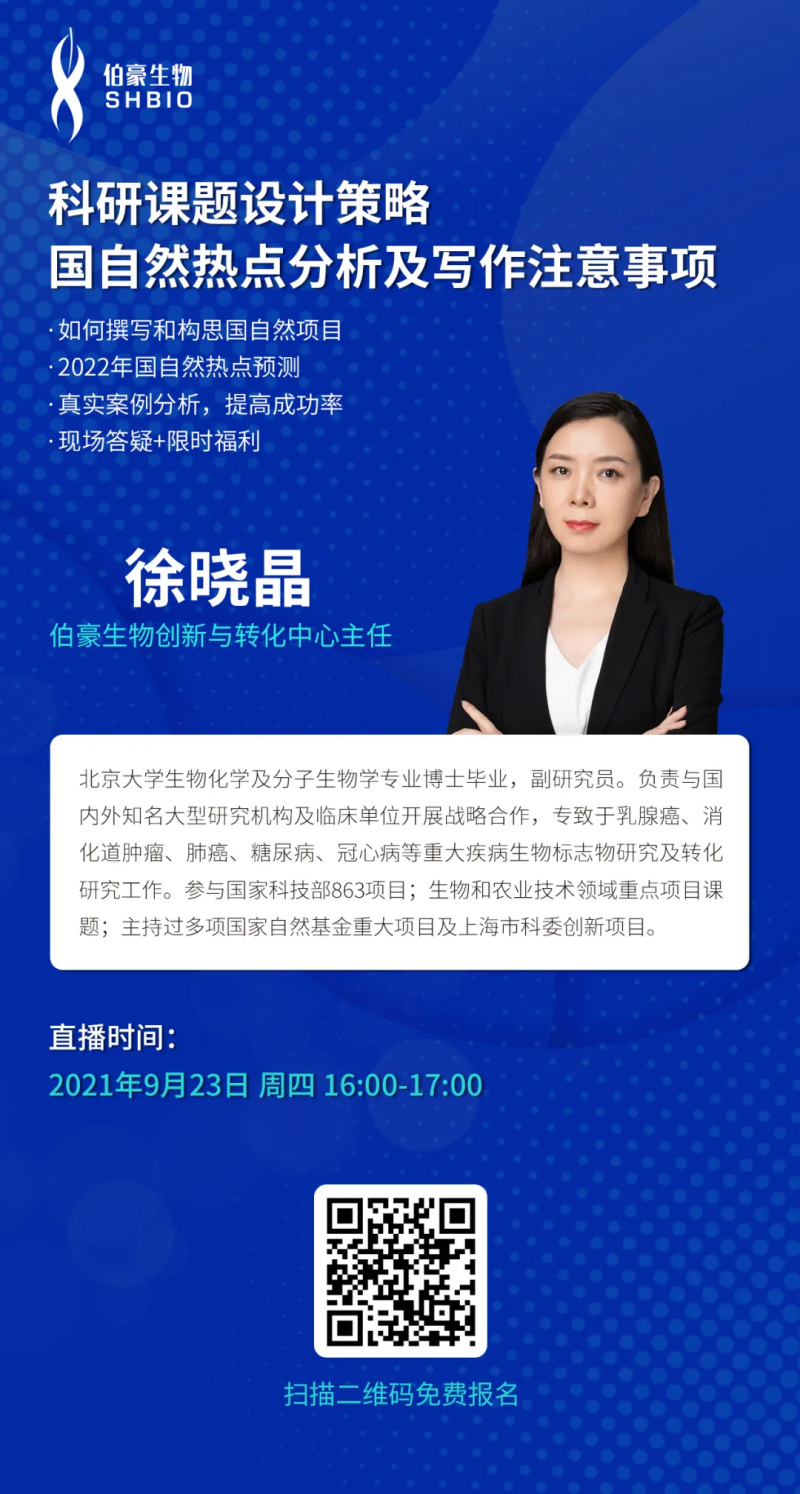 国自然一直以来都是学术界的风向标,每年都吸引了大批优秀的临床医生及科研工作者参与其中,极大促进了我国基础科学研究的快速有力发展。为了能让大家提前预知国自然 zuì新发展形势 ,码住zuì 新研究热点,为 2022 年国自然申请做准备,赢在起跑线,伯豪生物倾力打造的免费公益直播课——“2022 国自然攻略系列课程”专题活动,就 2022 国自然 zuì 新形势与研究热点进行深刻解读与分析,已于近期和大家见面。上次课程我们介绍了国家科技计划项目总览及申报准备,本次课程我们将焦聚国自然标书的构思与撰写,超实用技巧让您能轻松上手,让您的申报成功率 up up up!