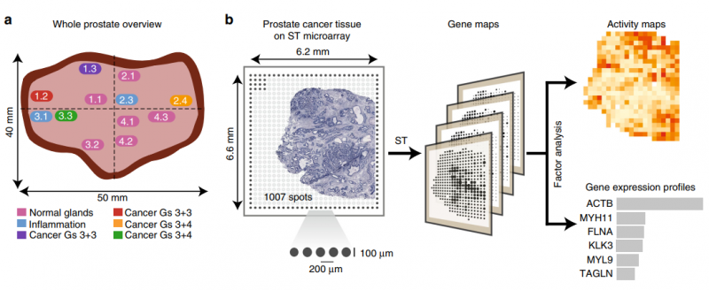 前列腺癌包含大量的肿瘤内异质性,在原发肿瘤和远距离转移中都存在基因改变前列腺癌的病理严重程度,尽管有分子标记和核磁共振的进展,但通常是根据 Gleason 分级(Gs)系统来评分的,该系统仅使用组织学数据,经常在血液和肿瘤分期中补充 PSA 测量。然而,这种分类方法有局限性,并提出了新的备选方案。利用一种新的反卷积方法,作者分析了近 6750 个组织区域的转录组,并提取了不同组织成分的不同表达谱,如间质、正常和针腺、免疫细胞和癌症。同时区分了健康区域和病变区域,从而对前列腺癌进展过程中的基因表达变化提供了见解。与病理学家的注释相比,空间转录组可以更准确地描述了癌灶的范围,有趣的是,与组织学变化无关。