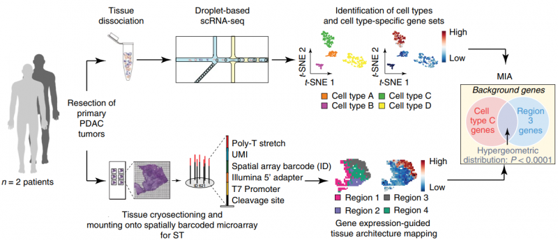 单细胞 RNA 测序(single RNA sequence,scRNA-seq) 能够系统地识别组织中的细胞类群,但它不能获取各个细胞类型在组织中的空间位置信息。空间转录组测序(spatial transcriptomics,ST),可以获得不同基因在组织切片上的空间位置信息,但不能获得详细的细胞类群信息。作者通过对胰腺导管癌病人的同一样本同时进行 scRNA 测序和 ST 测序。同时开发了一种多模态交叉分析方法(Multimodal intersection analysis,MIA)来将单细胞测序数据映射到空间转录组数据上,获得各种细胞类型在组织上的空间分布。研究发现导管细胞、巨噬细胞、树突状细胞和癌细胞的亚群在不同的空间位置区域上富集或丢失,以及与其他类型的细胞有显著的共富集。此外,作者还发现了炎症成纤维细胞和表达应激反应基因模块的癌细胞的定位。