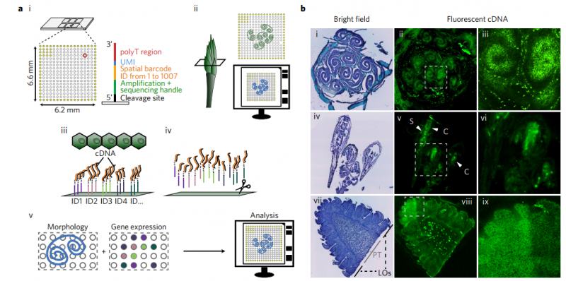 要理解复杂的生物系统,需要对特定组织域进行功能研究。然而,现有的空间转录组测序技术仅适用于有限范围的生物,主要是哺乳动物。在这里,作者提出了可用与植物组织的方法,在空间分辨率的状态下来广泛的解析模式植物系统。该过程包括高通量的空间转录组分析,然后是空间基因和通路分析。作者首先从模型被子植物和裸子植物的显微切片中生成空间转录组谱,证明了该技术的可行性。在拟南芥中,利用空间数据分析了 8 个花序组织结构域中 141 个基因和 189 条通路的表达水平差异。作者通过将空间转录组学技术和功能谱分析技术相结合这一新策略,应用于广泛的植物物种,该技术将是一种解决发育和进化生物学基本问题的关键方法。