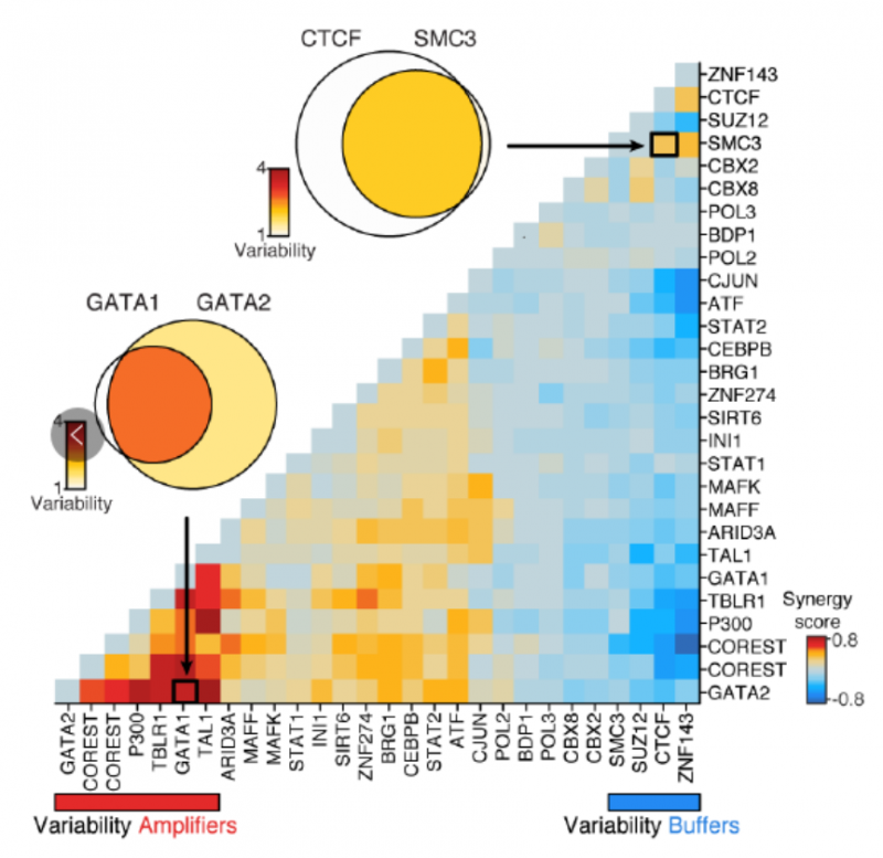 为了进一步验证方法的可靠性,作者又用 scATAC-seq 的方法对 ENCODE 细胞系,包括 H1 人类胚胎干细胞、K562 慢性粒细胞性白血病细胞、GM12878 类淋巴母细胞、V6.5 小鼠胚胎干细胞、EML1 细胞(小鼠造血祖细胞)、TF- 1 细胞(人类成红细胞)、HL-60 cells(人类 promyeloblasts)和 BJ 成纤维细胞 HL-60 细胞进行了分析。结果发现在增殖细胞中,复制时序结构域(replication timing domains)的染色质可及性的变异性增加。同时,作者还发现不同的转录因子可以通过协同或者竞争性结合的作用促进或者抑制染色质可及性的可变性。通过此方法对作者对大量转录因子的 ChIP-seq 数据研究绘制出了转录因子协同作用改变染色质可接近性的图谱。此外,还发现与高可变性相关的转录因子的是细胞类型特异的,在单细胞中染色质状态与组蛋白修饰也与染色质可接近性变化相关。