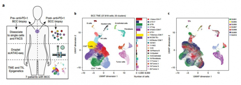 近期美国斯坦福大学的研究团队利用 10x Genomics 单细胞 ATAC-seq 技术,绘制了来自血液、基底细胞癌组织的 200,000 多个单细胞的染色质可及性图谱 [5]。文章对来源于 16 个健康人外周血及骨髓细胞的 63,882 个细胞核样本进行单细胞 ATAC 测序分析,基于染色质开放程度,鉴定出 31 个细胞亚群,并深入探索了免疫细胞谱系的调控轨迹。此外,研究团队还对 PD- 1 治疗前后采集的基底细胞癌患者的原发性肿瘤样本进行了检测,通过分析 37,818 个细胞的 ATAC-seq 数据,发现来源于不同患者的基质细胞、免疫细胞基本聚到一起,而肿瘤细胞的分群则表现出显著的异质性。在 PD- 1 免疫治疗后,对治疗有相应的患者中出现两种 T 细胞亚群(耗竭性 CD8+ T 细胞和 CD4+ 滤泡辅助 T 细胞)的扩张,且比例相当,暗示这两种细胞类型在 PD- 1 阻断后,其分化过程可能处于一致的调控模式。