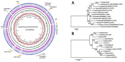 Pseudomonas knackmussii B13 于 1974 年被发现可以降解氯代芳香烃。本研究通过二代测序技术对 P.knackmussii B13 进行了全基因组测序。根据基因组注释结果发现,B13 有多种降解单芳碳氢化合物的代谢途径,包含氯苯甲酸,氨基酚,邻氨基苯加酸盐和偏苯三酚,但是不包含聚芳化合物。通过比较基因组分析发现,B13 与 P.denitrificans 和 P.aeruginosa 的亲缘关系比较近。B13 的基因组包含有至少 8 个基因岛,而这 8 个基因岛在其他的假单胞菌属是没有的。
