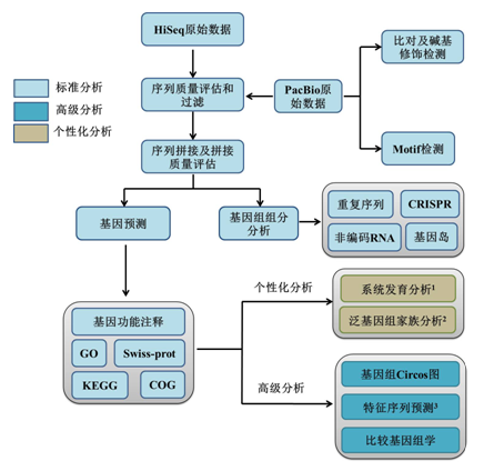 微生物基因组 de novo 测序是基于二代或三代高通量测序平台和生物信息分析技术,对微生物的基因组进行检测,进而获得细菌基因组的编码和变异等信息的一项测序技术。结合 PacBio 平台长读长与 Illumina 测序准确率高的特点,利用 PacBio 三代与 Illumina 二代测序数据,可以高 效进行微生物基因组的 de novo 组装。该测序类型无需该物种的基因序列信息便可完成全基因组的拼接和组装。在获得全基因组序列图谱,不但可以解析未知物种的进化历史,更重要的是可为该物种的后续研究提供一个方便高 效的平台,使基因挖掘、功能验证等工作更加方便和快速,也为更深层次的组学研究提供了参考数据基础。