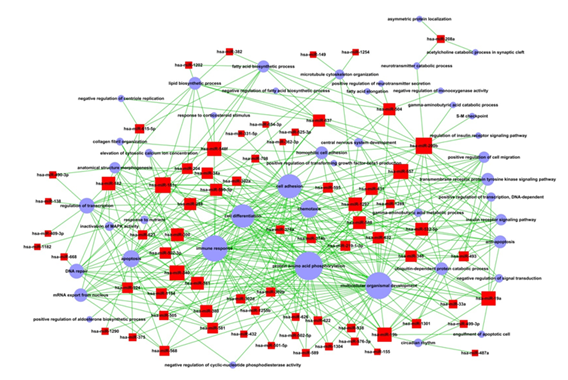 对筛选出的核心靶基因进行 GO 富集分析,通过靶基因的功能来关联 microRNA 与 GO 之间的关系,从而间接得到 microRNA 调控靶基因影响的功能。