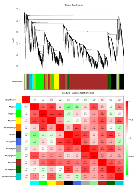 寻找协同表达的基因模块(module),并探索基因网络与关注的表型之间的关联关系,以及网络中的核心基因。