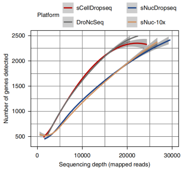 1、随着测序深度的不断增加,单细胞核转录组测序(snRNA-seq)和单细胞转录组测序(scRNA-seq)得到的基因数相近。