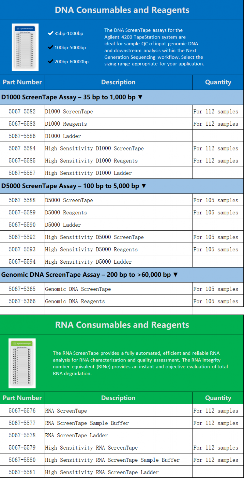 Agilent TapeStation systems are automated electrophoresis solutions for quality control (QC) of DNA and RNA samples. The TapeStation systems are all-in-one platforms, which include instrumentation, data processing software, reagents, and ScreenTape devices for analysis of sample size, quantity, and integrity. Delivering highly accurate and precise analytical evaluation, the systems fit perfectly into next-generation sequencing (NGS) or biobank workflows for low to high sample throughput.